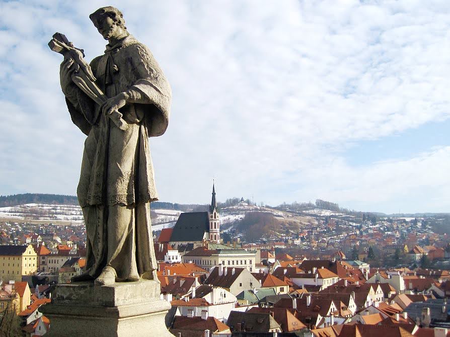 聖ヨスト教会(St. Jost Church)は尖塔のトップの丸い形が独特で、 青緑色が遠目からもひと際目立って見えました。 チェスキー・クルムロフ城からほど近く、ヴルタヴァ川沿いに建っていました。